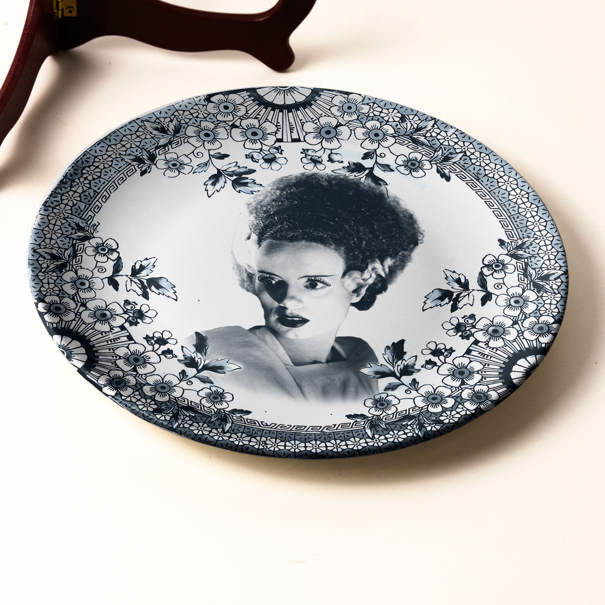 This elegant ceramic plate showcases the unforgettable image of the Bride of Frankenstein, portrayed by Elsa Lanchester in the 1935 Universal classic. Surrounded by a refined floral border, the design merges timeless porcelain artistry with the dramatic beauty of one of horror’s most enduring characters. A must-have for fans of classic monster movies, gothic décor, and vintage Hollywood memorabilia.