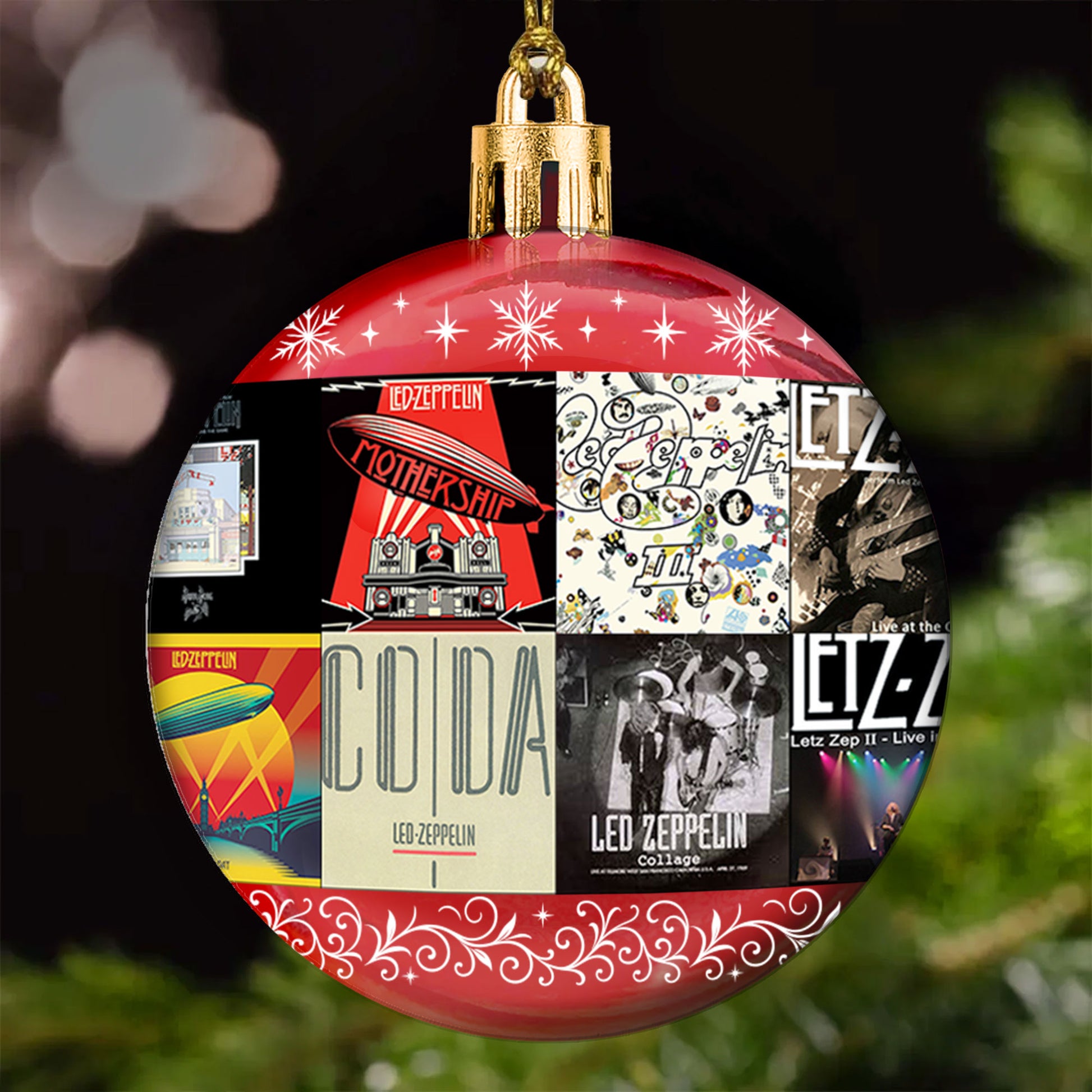 Turn up the nostalgia this holiday season with the Led Zeppelin Ball Ornament — a tribute to the band that redefined rock history. Featuring a collage of their legendary albums like Led Zeppelin I, Houses of the Holy, and Physical Graffiti, this ornament captures the energy, mystery, and power of their music. Set against a deep blue background with snowflake accents, it’s the perfect keepsake for fans who live for epic riffs and timeless rock anthems.