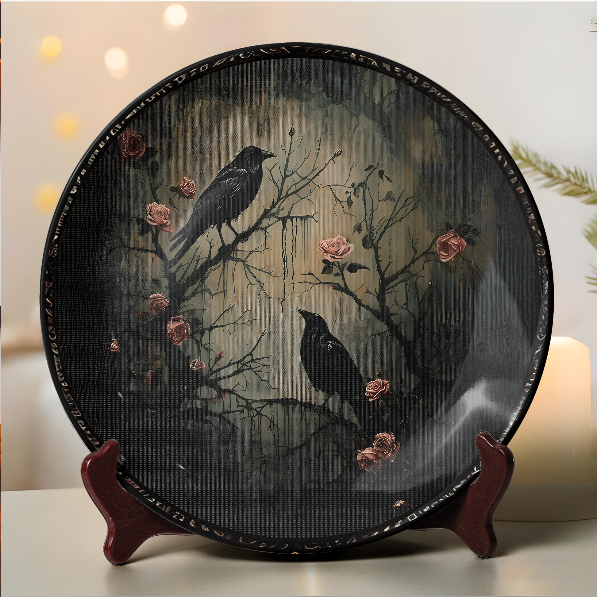 Raven & Roses Gothic Decorative Ceramic Plate – Dark Romantic Elegance